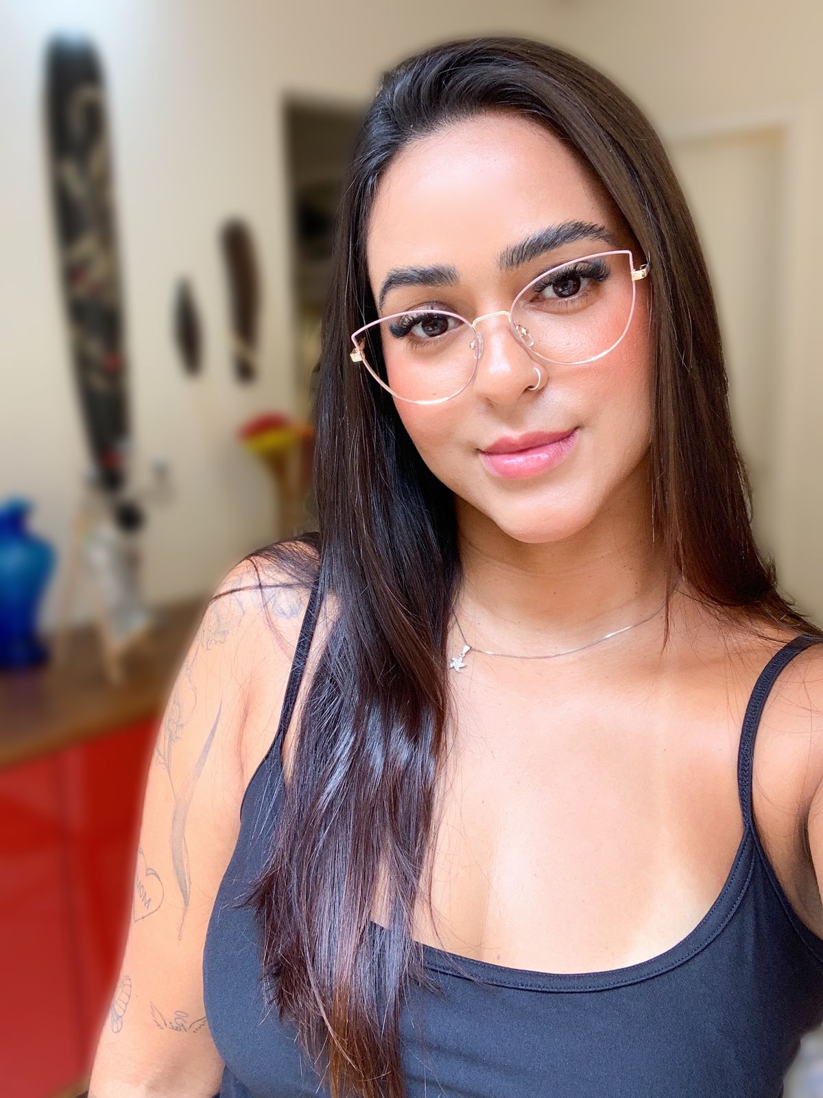 Armação no metal cor Nude, com leve gatinho no canto superior. Detalhes no metal dourado.