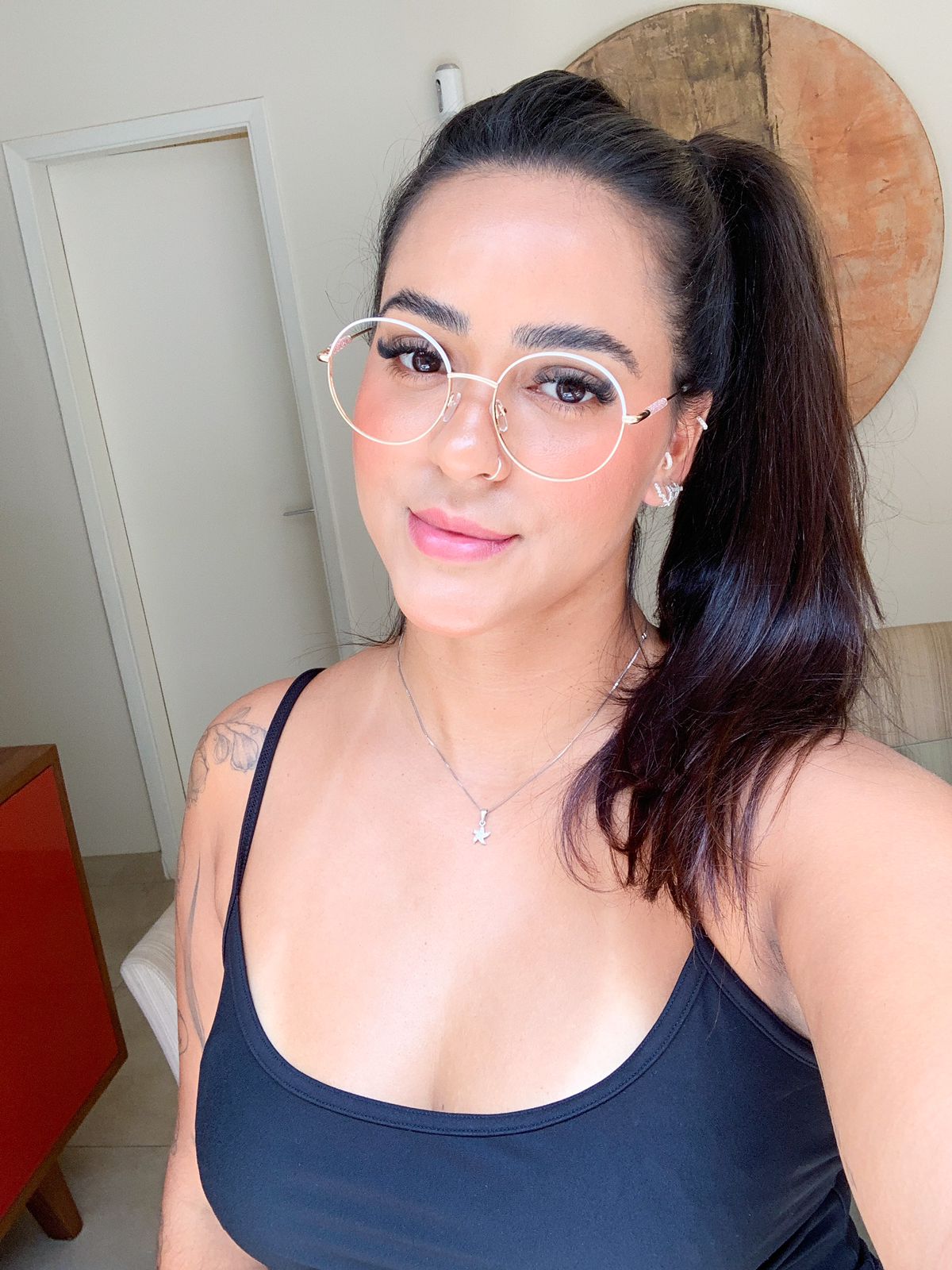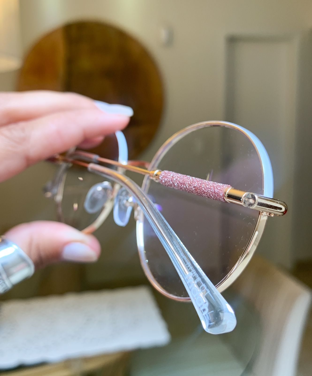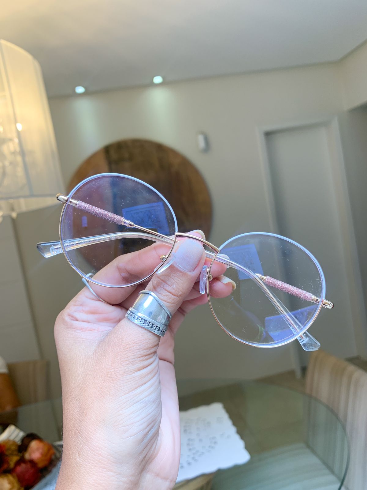 Armação em Metal dourado com parte superior branca. Haste com glitter.
