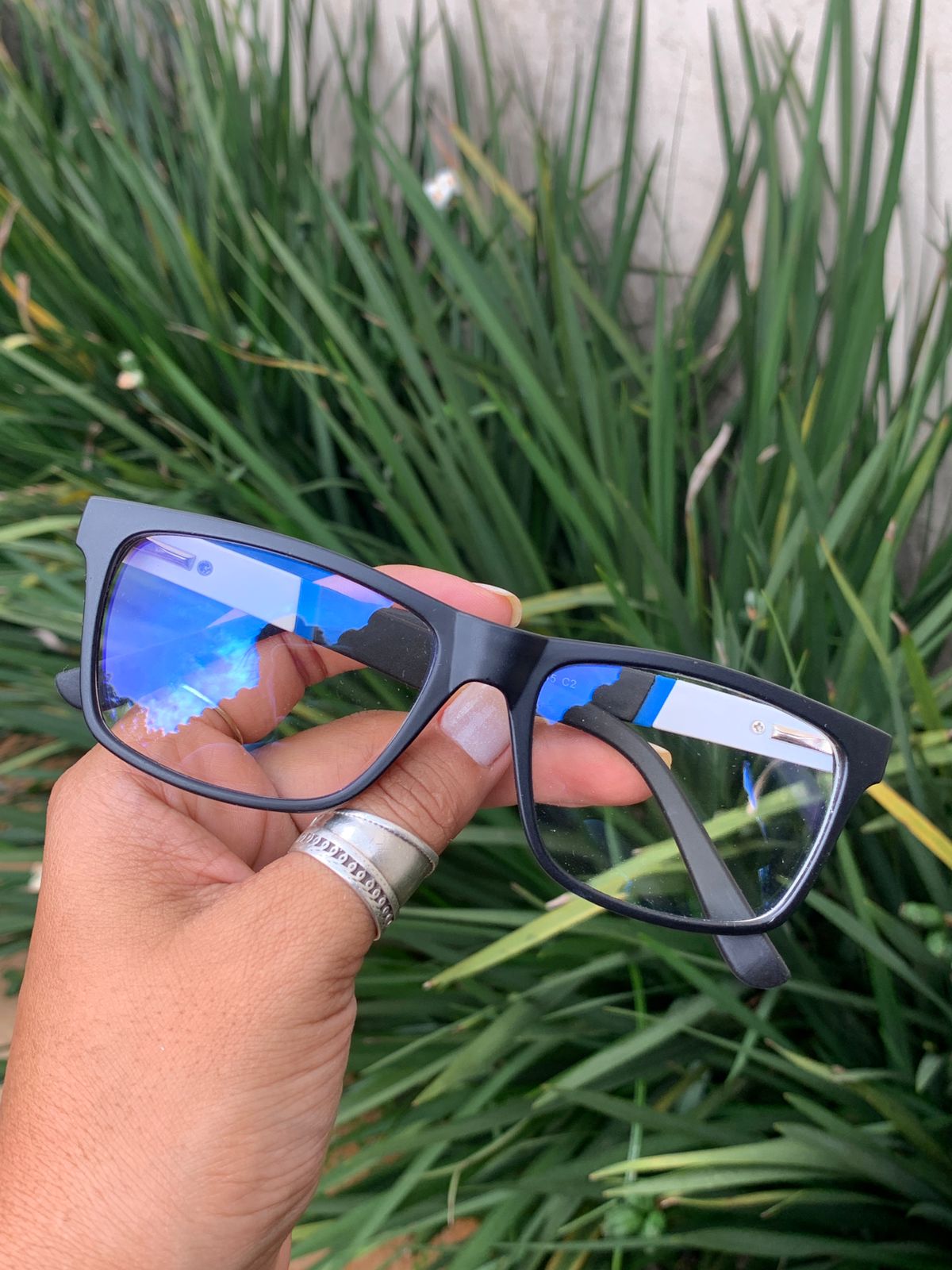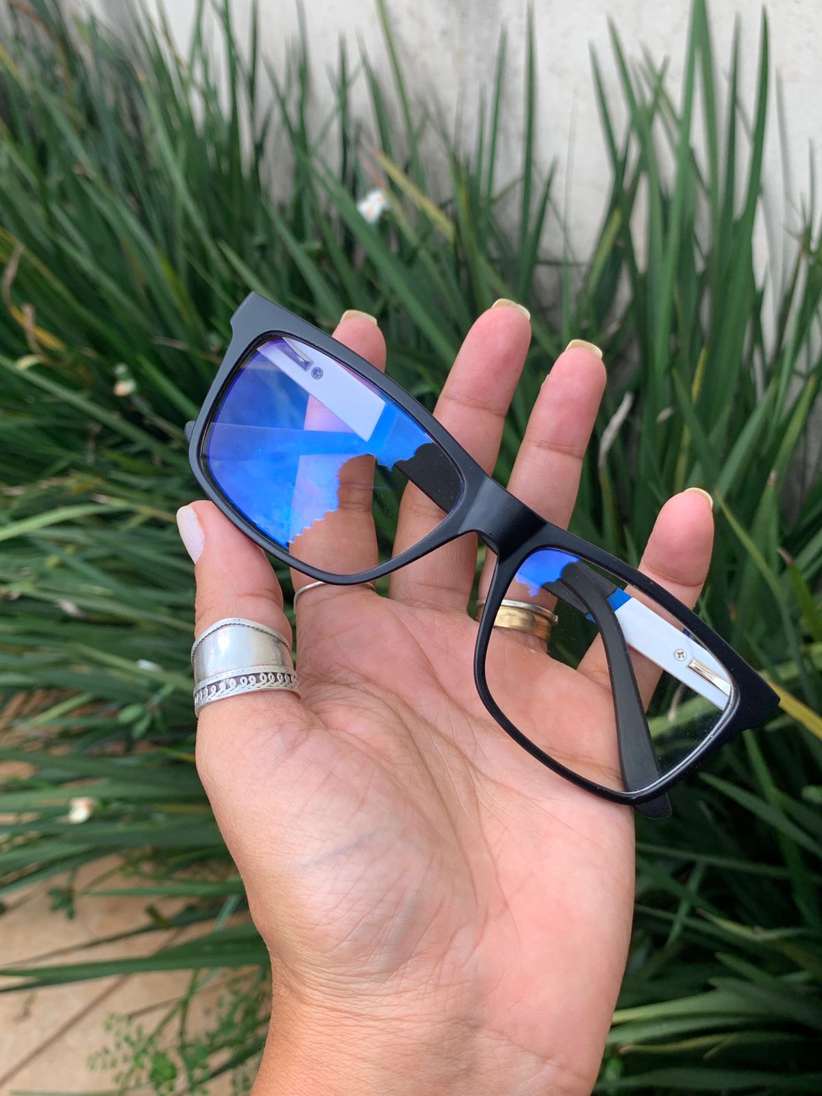 Armação em Acetato extremamente reforçado na cor Preta, detalhe na haste emborrachada para um maior conforto, na cor branca e azul.