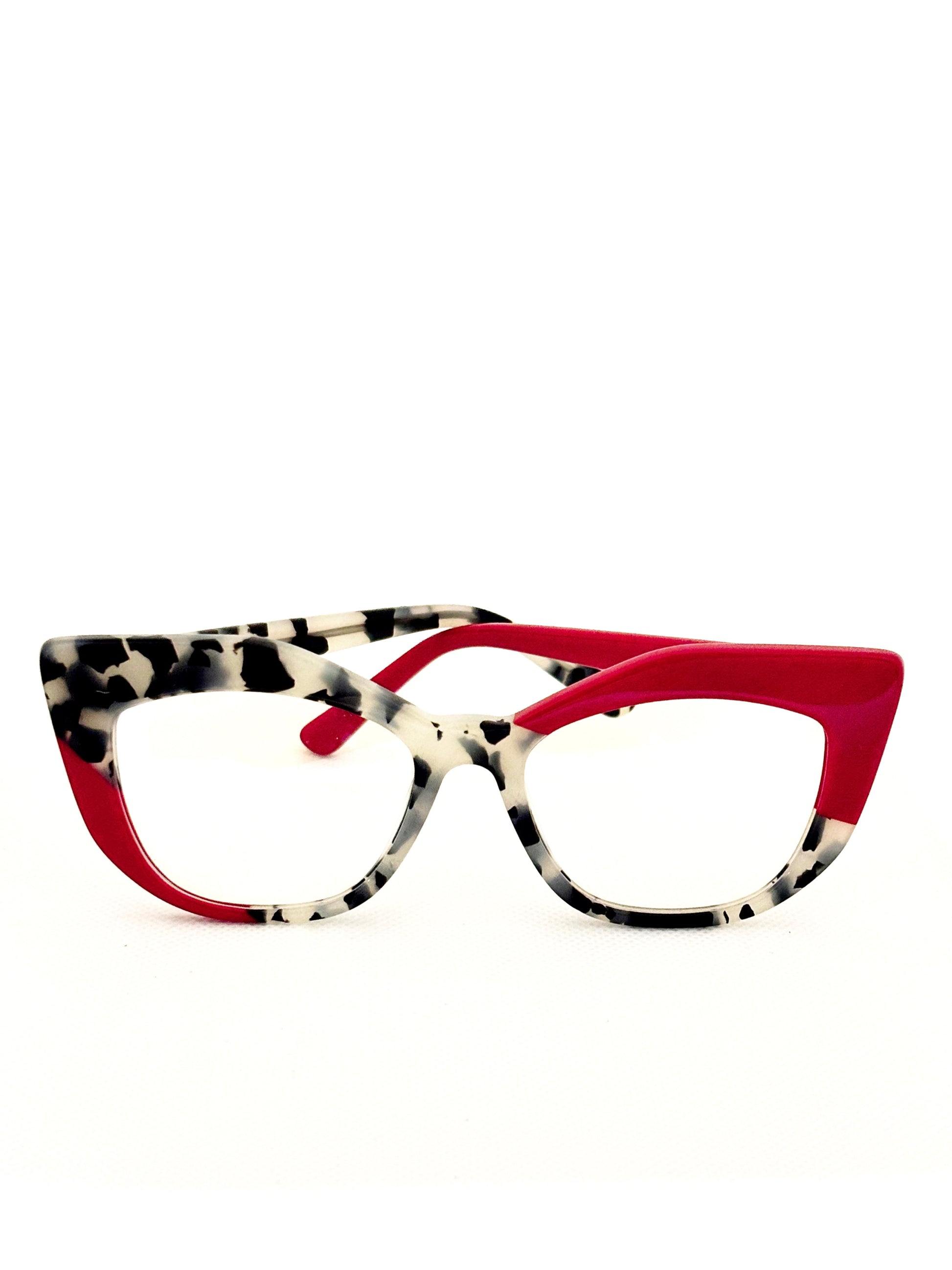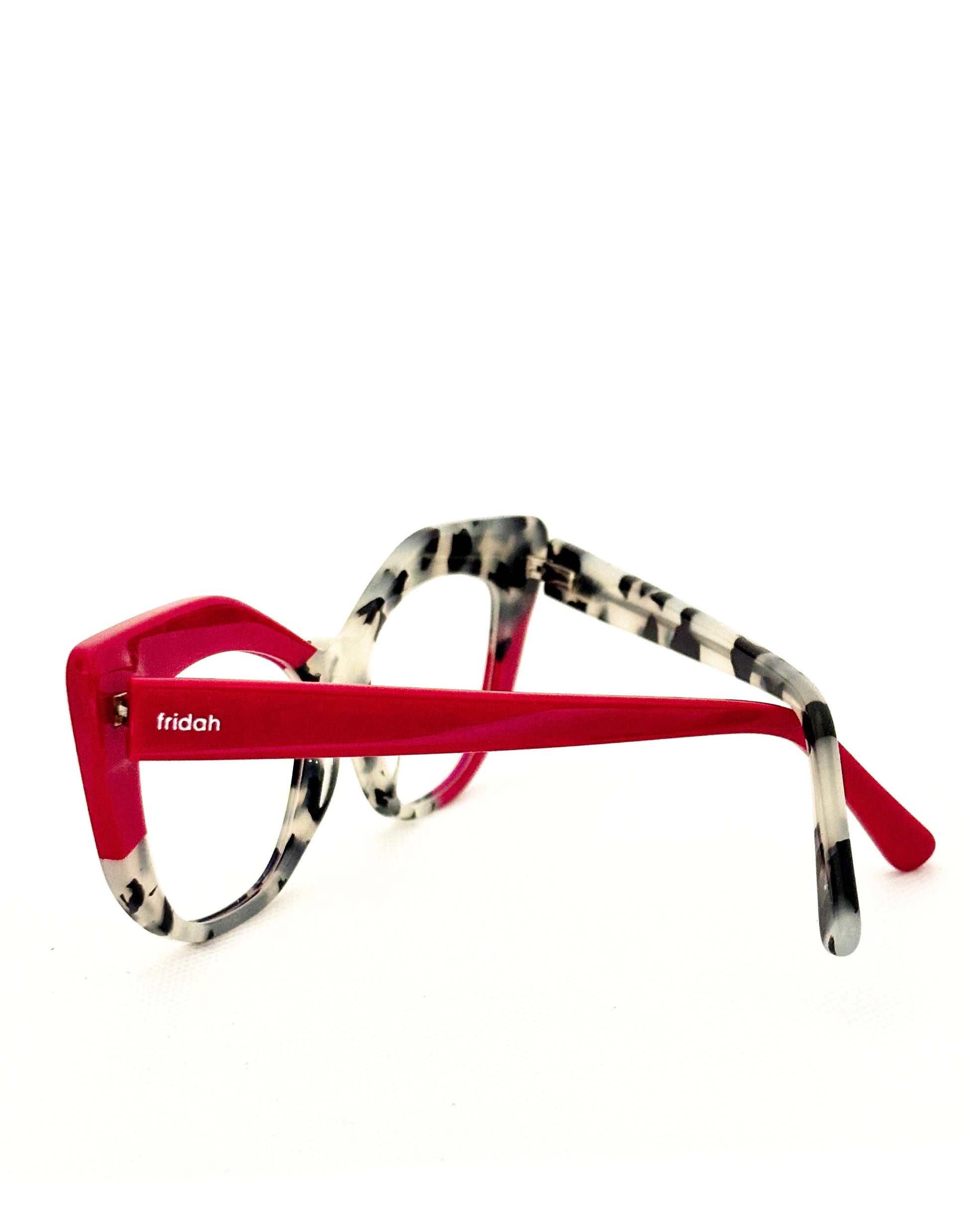 Armação em acetato vermelho com detalhes na haste em animal print.