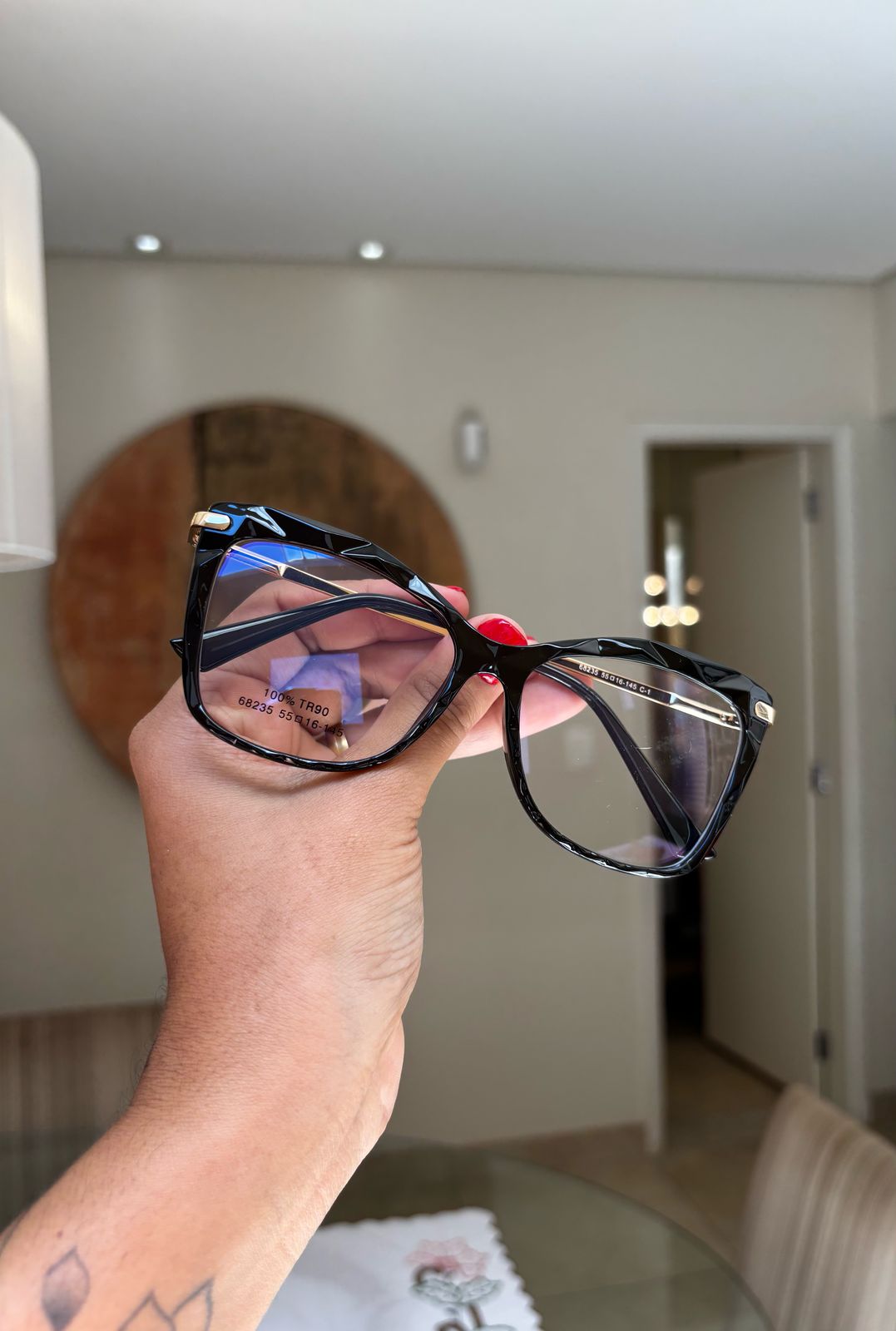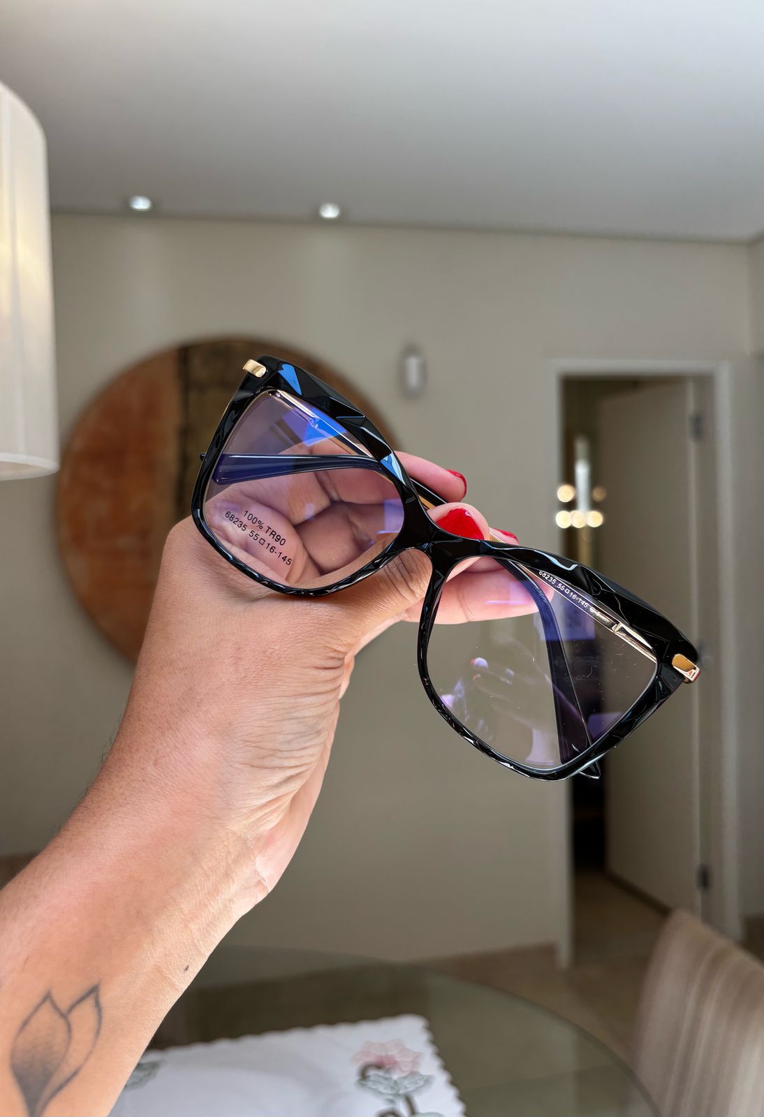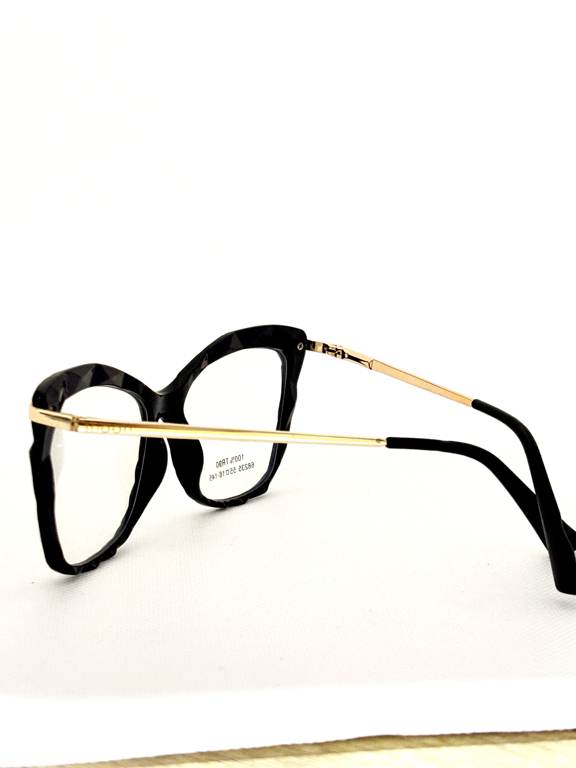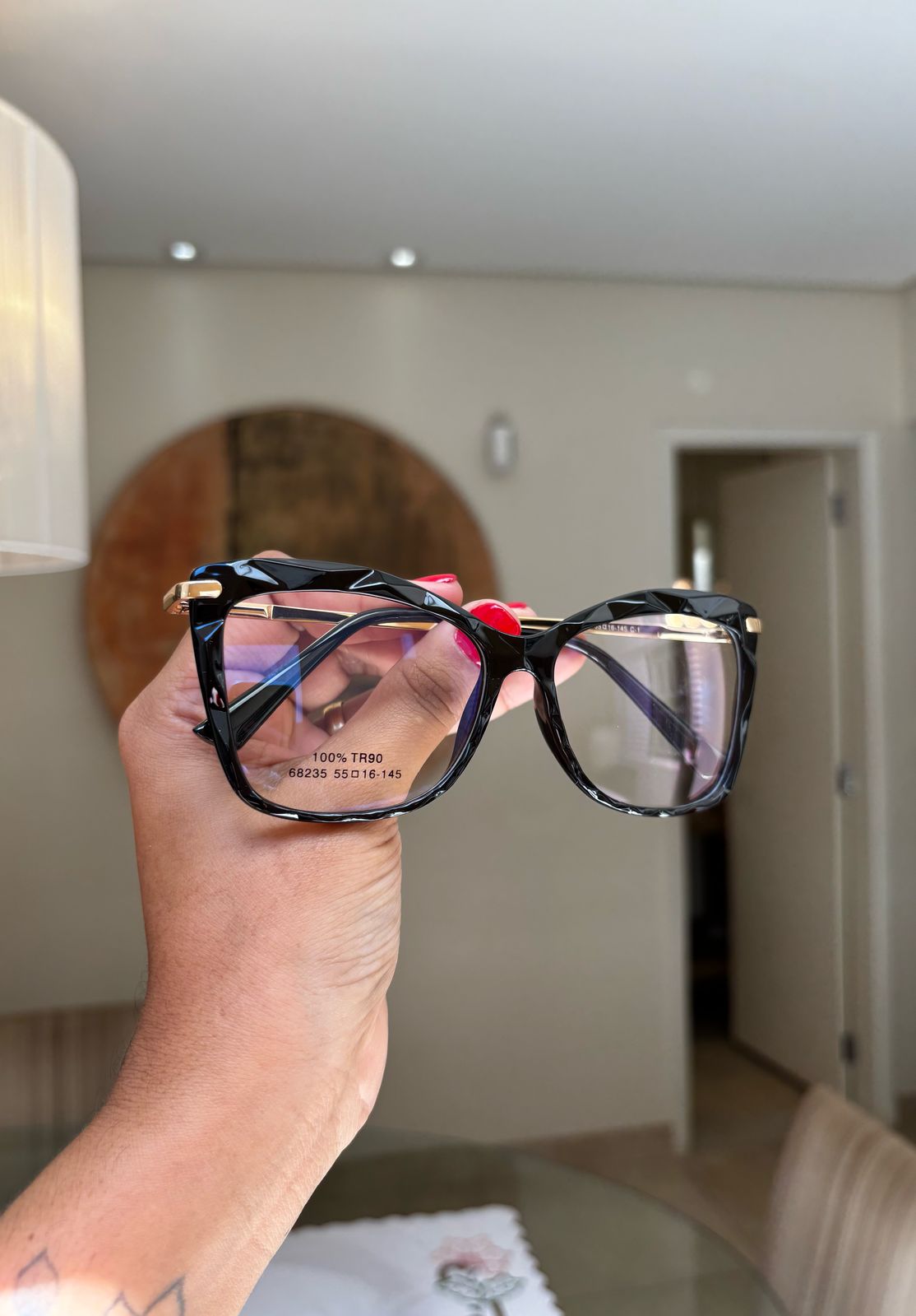 Armação em Acetato Preta com alto relevo e haste Dourada.