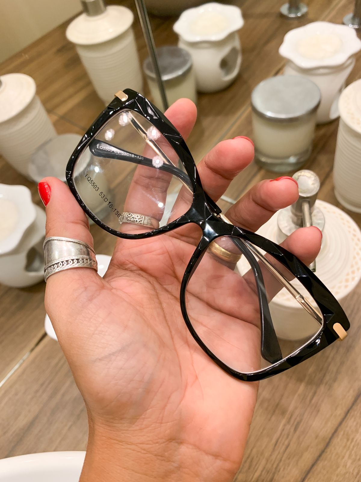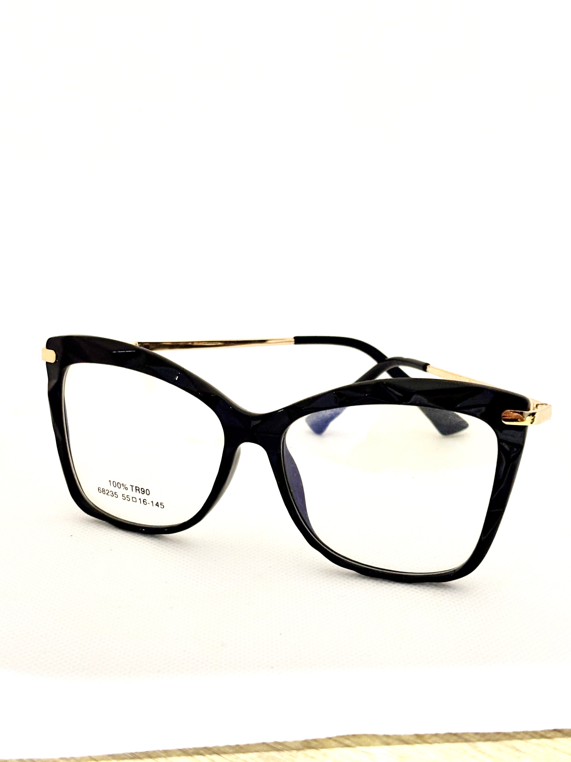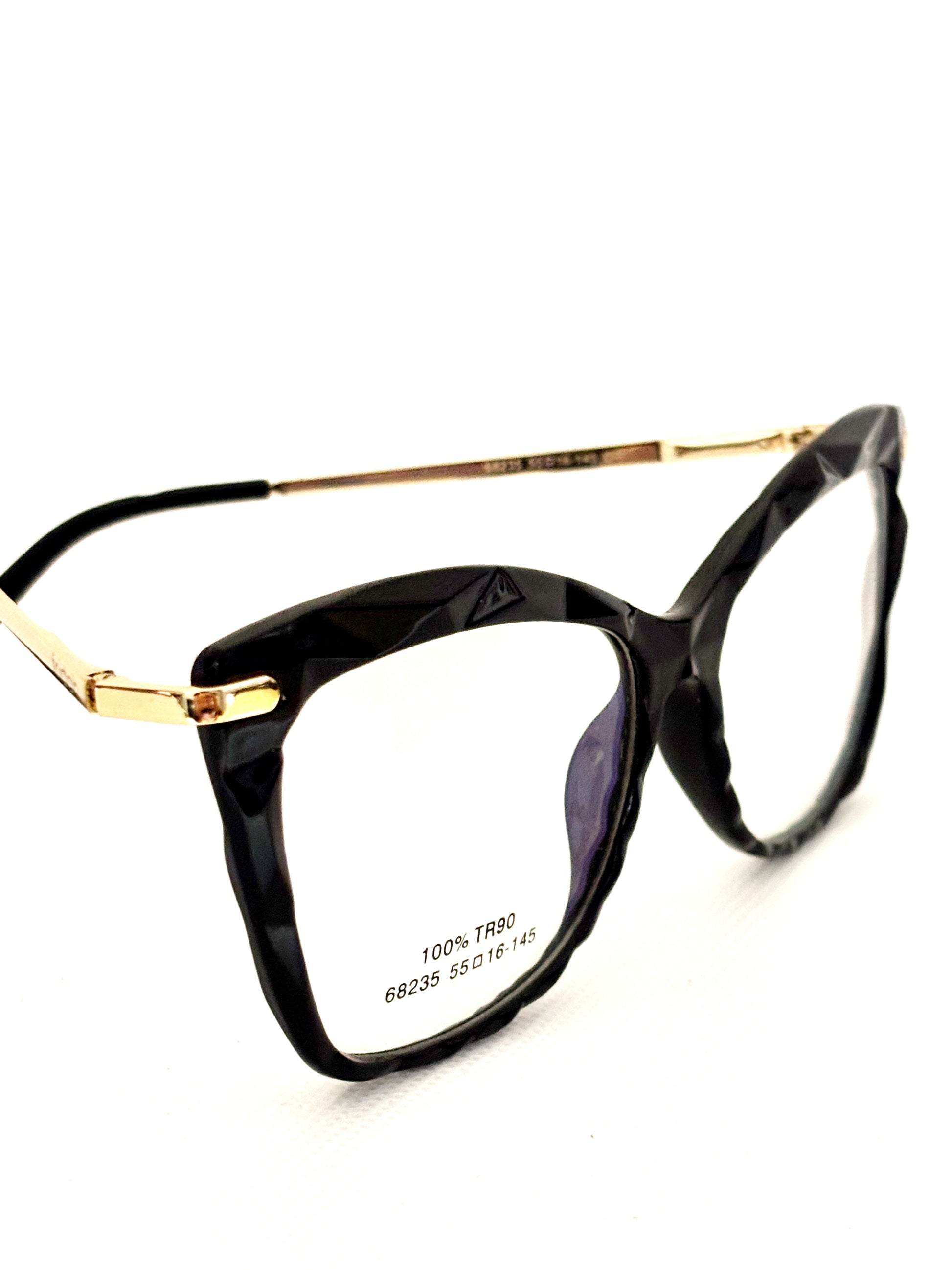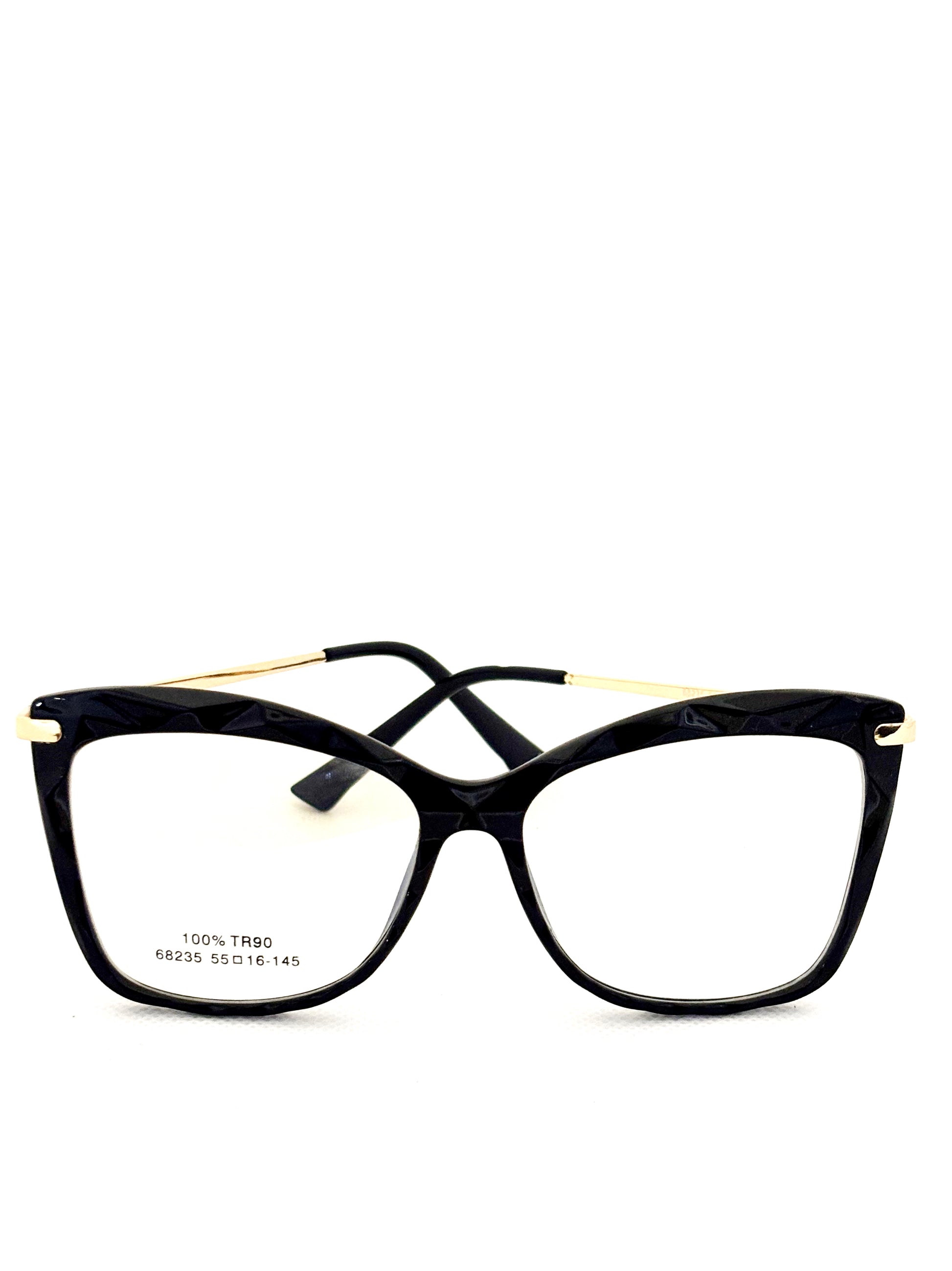 Armação em Acetato Preta com alto relevo e haste Dourada.
