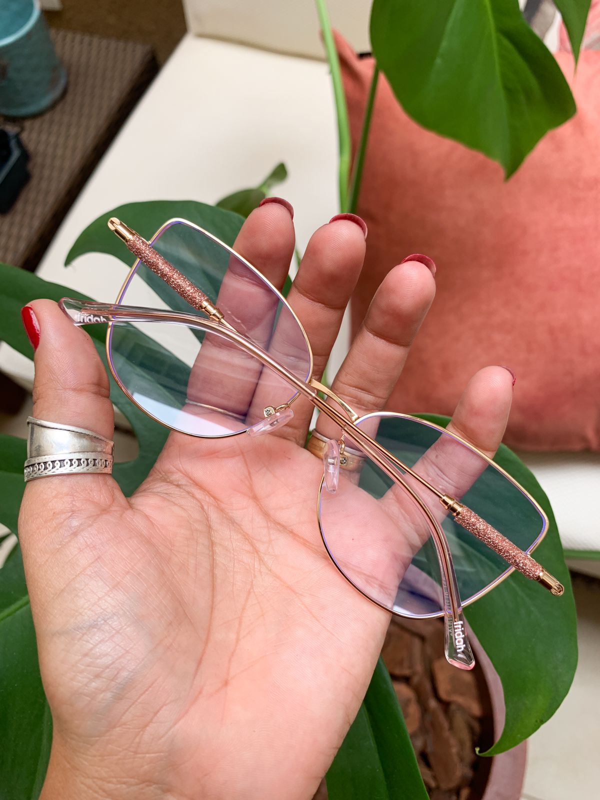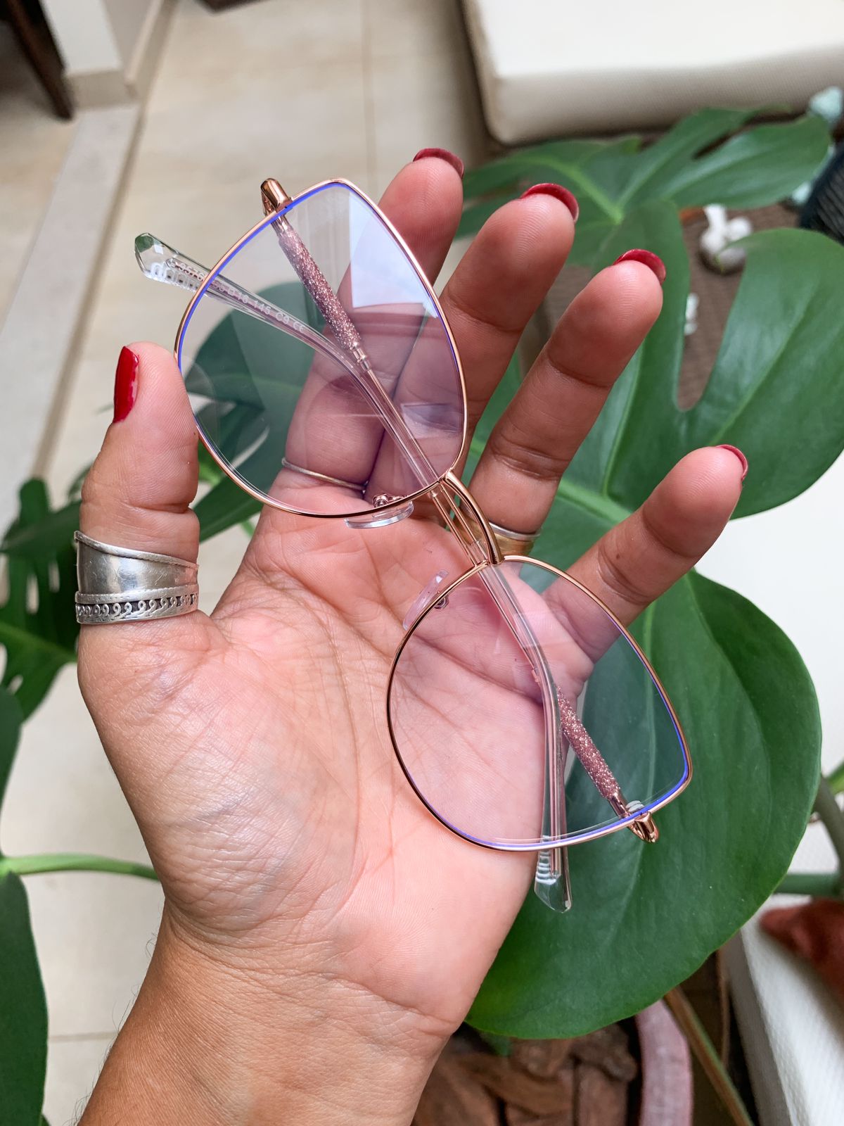 Armação em Metal, Dourado Rosê com haste Dourada e detalhes em Glitter.
